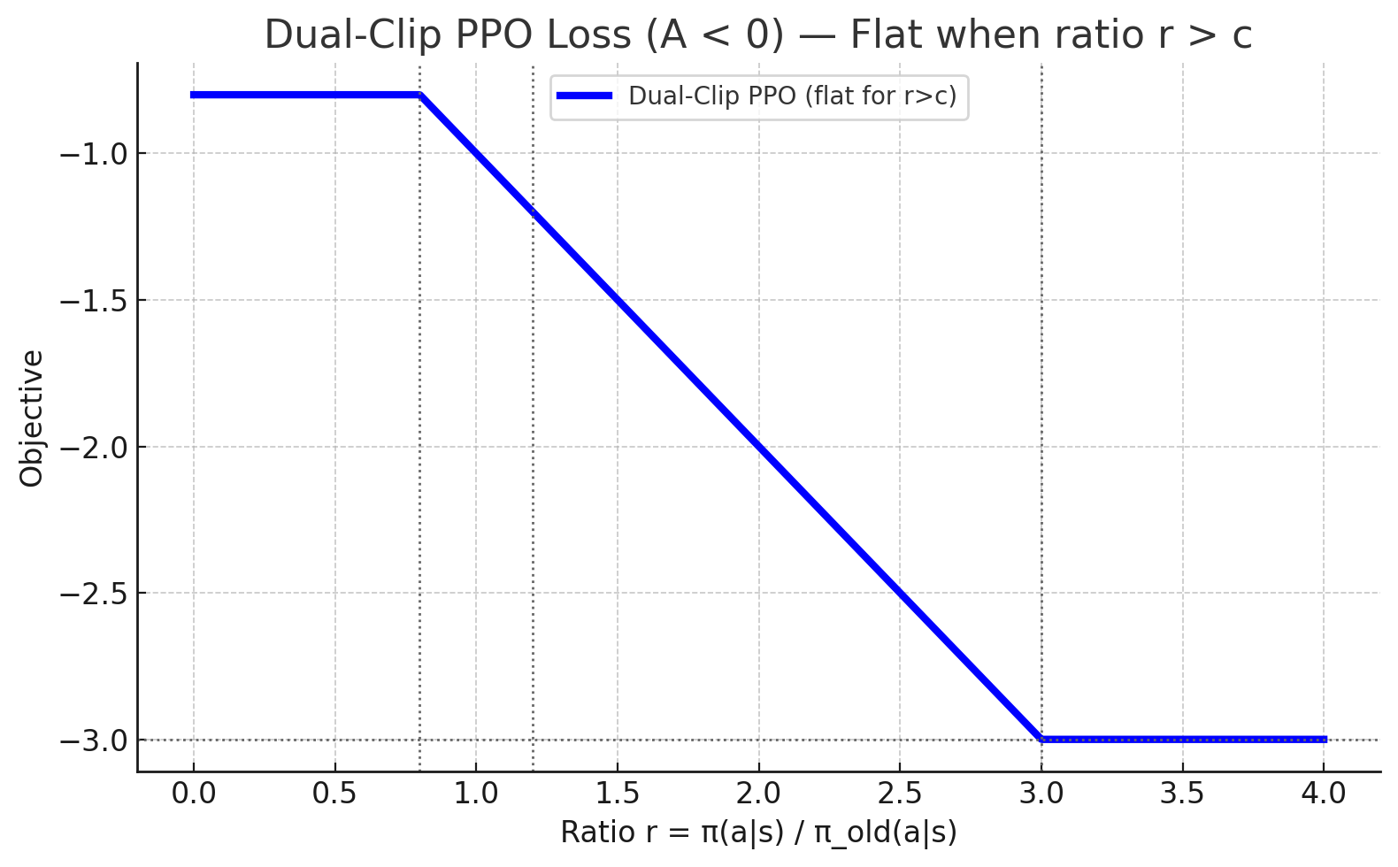 Solution: Dual clip loss bounds the loss magnitude, preventing training instability.