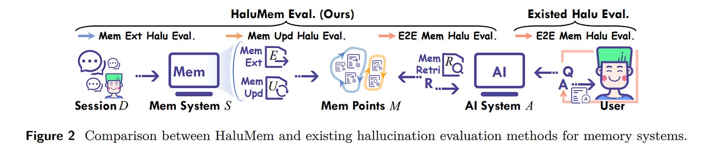 HaluMem introduces the first operation-level benchmark designed to evaluate hallucinations within AI agent memory systems. Unlike previous end-to-end evaluations, HaluMem diagnoses hallucination origins across distinct stages: memory extraction, updating, and question answering.
